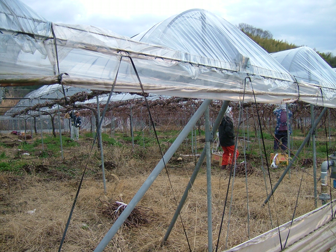 私の手がけている品種はピオーネ、安芸クイーン、藤稔を栽培してます。最近は藤稔を伐採し、ニューベリーA、ゴルビーに改殖中です。 面積は加温ハウスが約75a トンネルメッシュ約75a 併せて150a程度あります。
