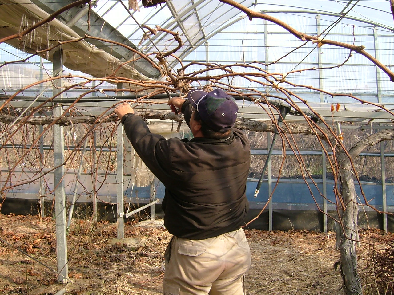 私の手がけている品種はピオーネ、安芸クイーン、藤稔を栽培してます。最近は藤稔を伐採し、ニューベリーA、ゴルビーに改殖中です。 面積は加温ハウスが約75a トンネルメッシュ約75a 併せて150a程度あります。